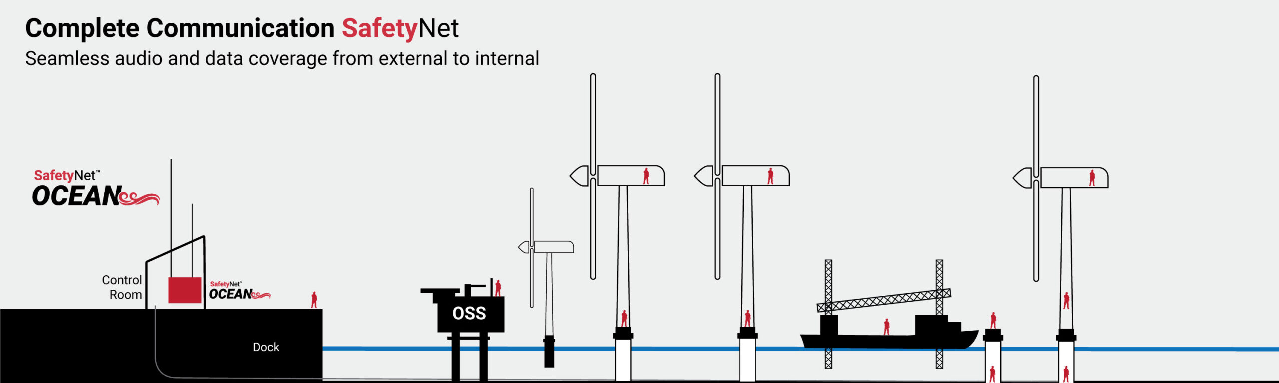 SafetyNet Ocean is designed to be a multi-user system, delivering data effortlessly between land-based control rooms, offshore service platforms, service vessels, workers within the field, and to workers inside a turbine tower, within an integrated wireless system.
